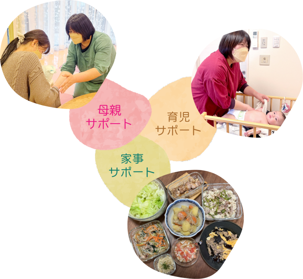 家事代行やベビーシッターさんのお仕事とは少し違い、育児の不安を解消するために産後のお母さんとご家族を丸ごとサポートします。